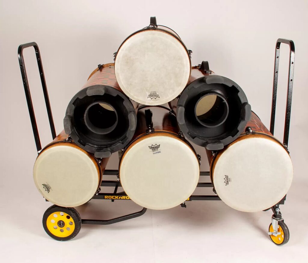 Additionally, West Music carries Rock ‘n Roller Carts, which are perfect for moving large quantities of Tubanos. We have 6 sizes of carts, which break down and can fit into most spaces for easy storage purposes. Place a Tubano on its shell side; I recommend the handle faces up, so it’s easy to pick off the cart when needed, then insert another Tubano next to it, filling the cart’s bottom layer. Then repeat if you have more on top of the first layer. This method will not damage your Tubano. I typically like switching the facing of the head direction so my cart can balance better but again, that’s up to you. We also have straps in case you need to strap down your Tubanos.