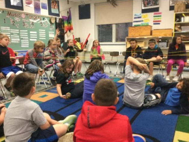 Students sing one solfege syllable on a major scale and then toss the yarn to another student to sing the second pitch. If the students weren’t quite on the pitch, a few students would sing along to help their peers match the correct pitch.