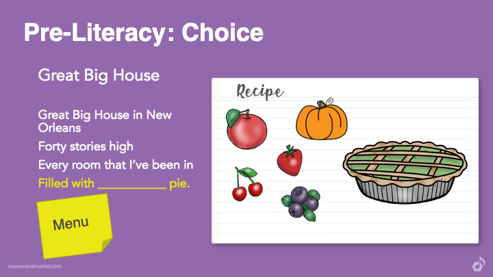 Notice that as we add choices, students may struggle with timing. Begin with two options and expand as your students are able. Encourage students to look over the choices on the recipe card while singing the song.