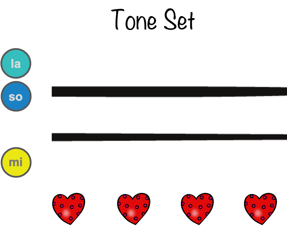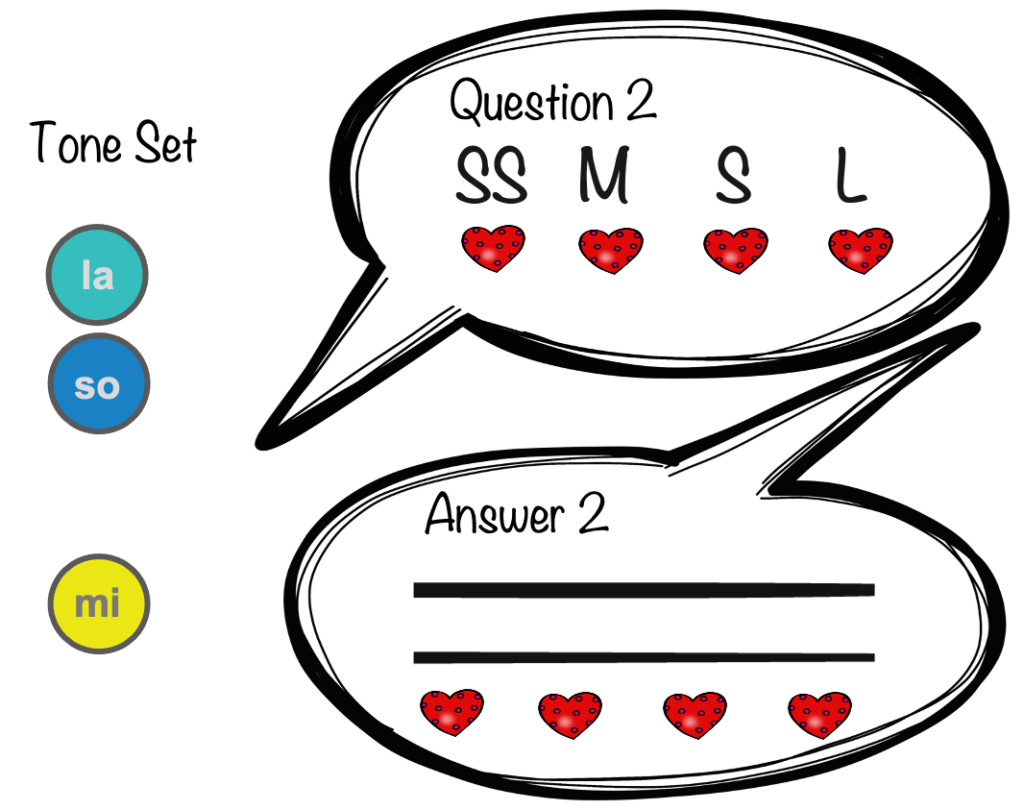 Before we remove all of the visual supports from students, we need to enter a hybrid reading and improvising stage. Providing students with a visual tone set, the staff, and the number of beats they are required to sing will support students when we expect students to sing an answer spontaneously. Keeping the tempo slow allows students to visualize the pitches on the correct lines and spaces as they sing.