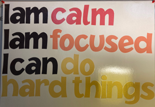 Affirmations help establish a positive mindset. I have five affirmations displayed in my classroom that we read every day: “I am calm. I am focused. I can do hard things. I can choose kindness. I am important”. My goal is for students to internalize these as mantras so they can utilize them during other parts of their day.