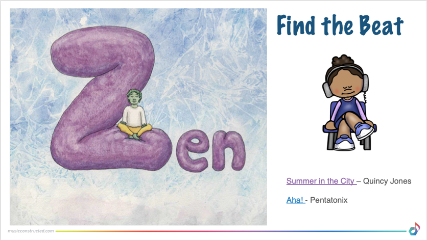 Every week, I choose one or two songs per letter to have students listen to at the start of class. I project the image from the book with a brief reminder of what students should listen to while the music plays. Students listen for about three minutes while transitioning into class and moving to their spots.