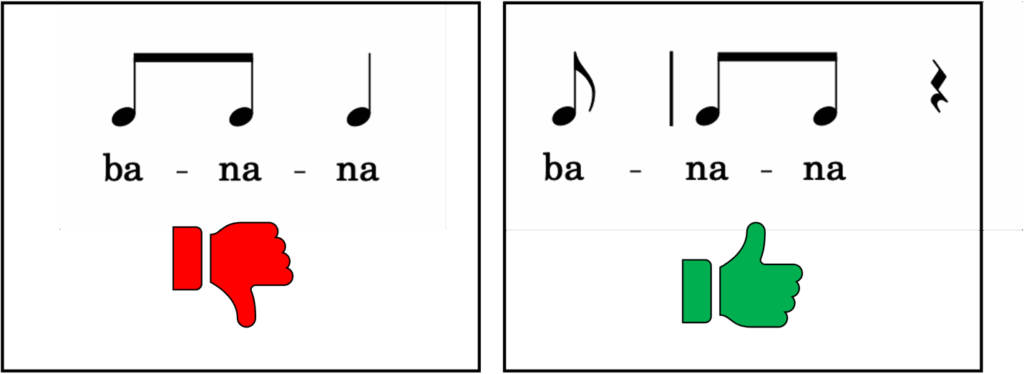 The most important part of an affirmation is the text. The words convey the message you want your students to internalize. Equally important is setting the text to a rhythm that aligns with natural speech prosody. Take the word “banana” for example—where does the stress fall? Since the stress is on the second syllable, the word has a natural anacrusis.