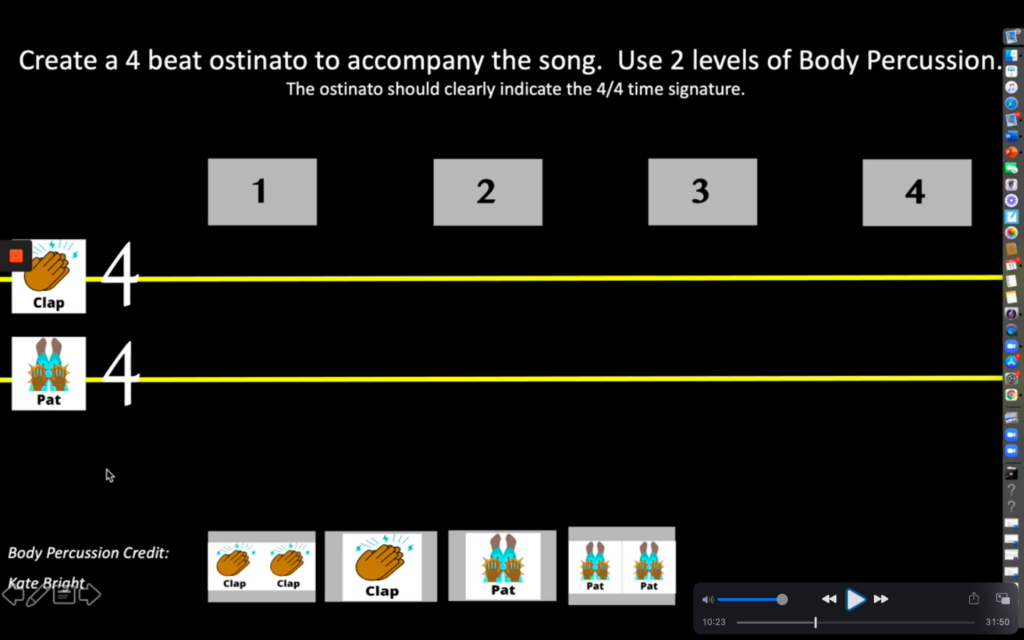 Then I can create multiple copies, assign each group a page, and they will be able to interact with the template by clicking and dragging the body percussion icons onto the staff in their breakout rooms. This activity allows students to share the body percussion ostinato they created in their small groups with the whole class.