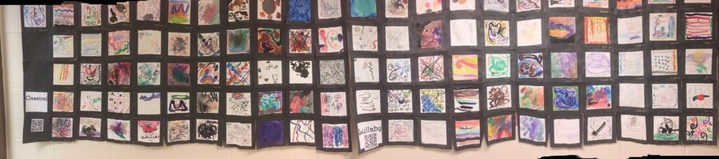 Student Reception: We lined up all the paper quilt squares our second-grade students made in art and created a quilt for each musical style.  In the description of this collaborative artwork, we also included a QR code so anyone who looked at the Musical Quilt could listen to the music that inspired the artwork.  The students enjoyed looking at each other’s work and seeing the collaborative piece come to life!