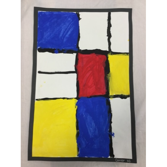 Piet Mondrian (1872-1944) was a Dutch painter and art theoretician considered one of the greatest artists of the 20th century.  His iconic works of black lines and primary colors are recognized in his paintings and are the inspiration for tattoos, clothing, and countless other things, including matchbox cars.  In this project, kindergarteners begin their study of lines and primary colors in the art room and complete their learning using unpitched percussion instruments to “perform” the artwork of Piet Mondrian.