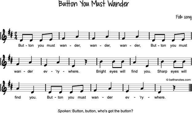 Formation: Students sit in a circle on the floor with one student in the middle (“It”). Before starting the song, “It” closes eyes while the teacher gives a button to one student in the circle. Tell the other students to be “sneaky” and pretend to hold the button in their hands. When the singing starts, “It” opens eyes while students in the circle pass the button around the circle. The students without the button pretend to pass a button, so it looks like everyone is passing the button. At the end of the song, the class stops passing and chants, “Button, button, who’s got the button?” “It” gets three chances to guess who ended up with the button.