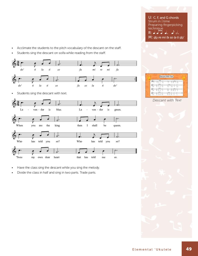 This book, in my opinion, is geared toward middle and upper elementary grades. This resource also comprehensively explains the tips and tricks for incorporating the ukulele into music class and the importance of researching the origin of song material. The lessons presented include movement, utilizing classroom instruments, singing while accompanying yourself on the ukulele, and a few lessons incorporating the ukulele into ensembles, including digital resources.