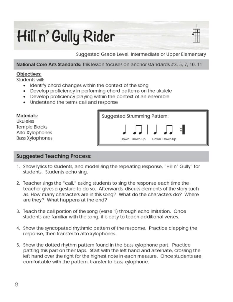 This collection of 21 lessons integrates ukuleles with other classroom instruments, including full Orff-style orchestrations. These lessons span a wide range of grade levels. In addition to PDF files, there are lyric sheets, videos, and additional resource materials. Lessons include movement/ dance suggestions, Polynesian instrumental suggestions, a Hawaiian Language guide, and strumming techniques.