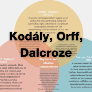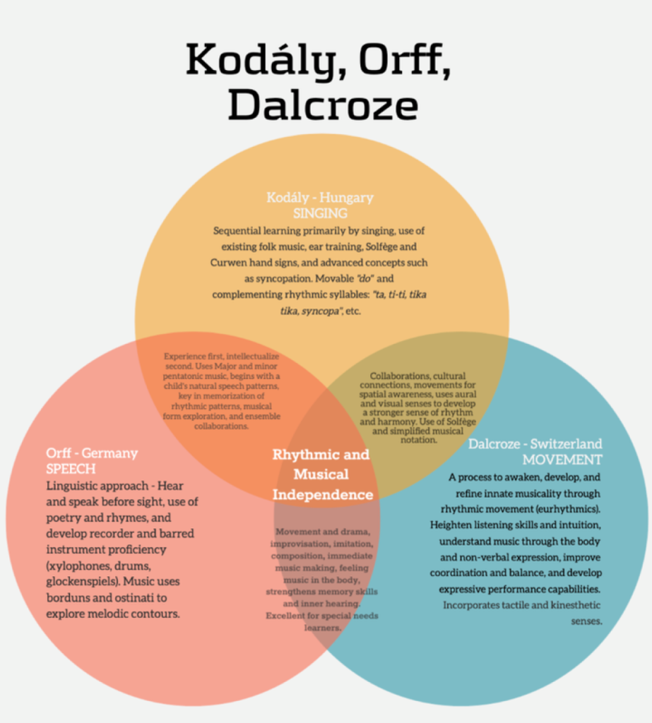 So, where should you start with your general music classes? How do you pick a pedagogy that will enhance your program and develop well-rounded musicians? Many of us already use activities from two or more of these methods daily to supplement our programs, perhaps with an inclination towards one in particular. Read on for a breakdown of these pedagogies, and keep in mind that it is by no means a complete scope. The emerging and prolific music student will surely benefit from all three pedagogies.